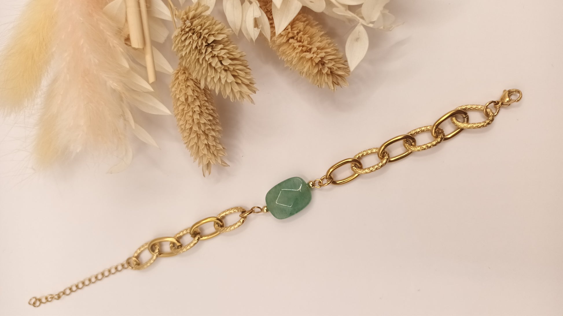 Bracelet femme en acier inoxydable grosse maille ovale et torsadée et pierre verte d'Aventurine.