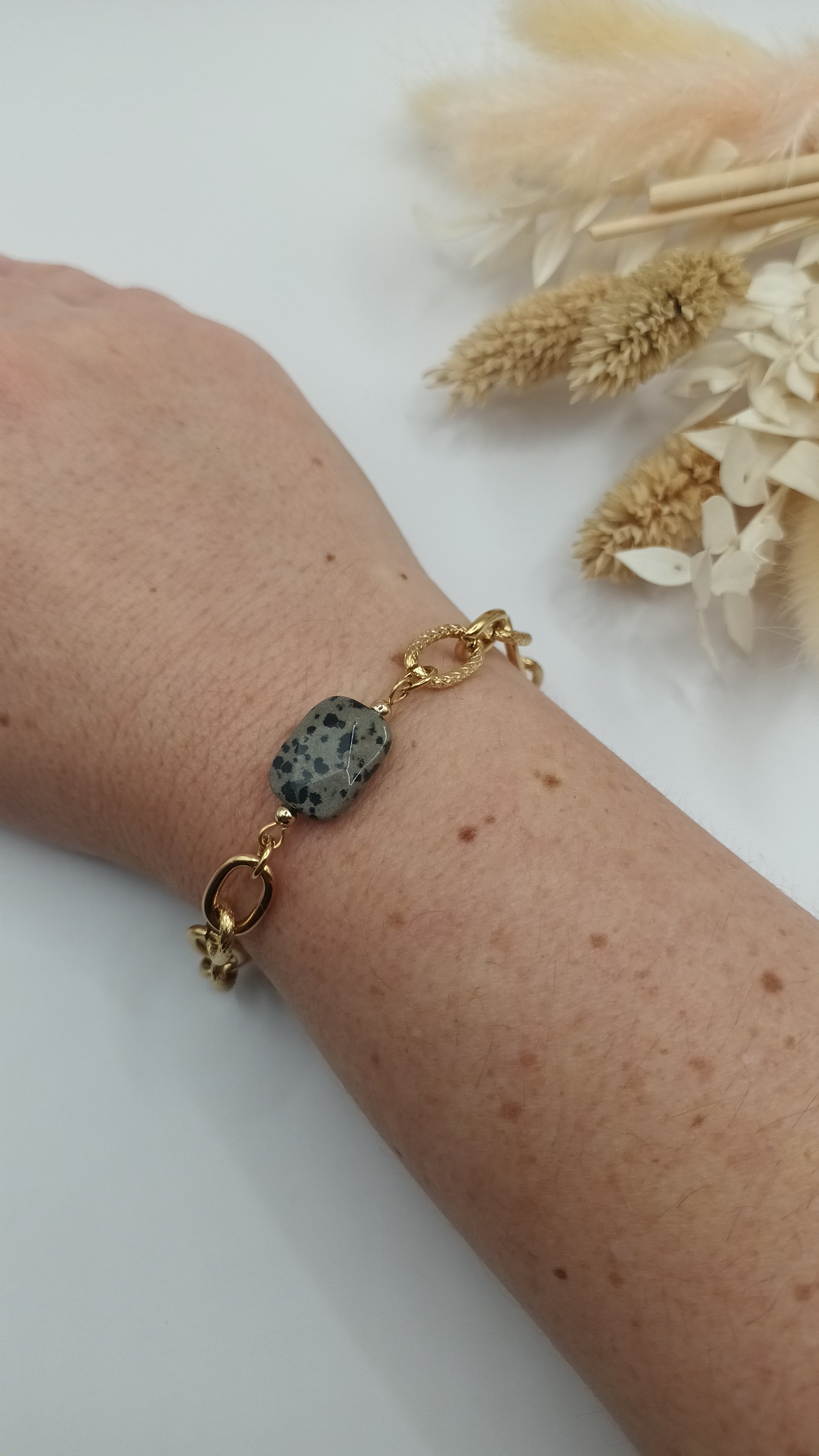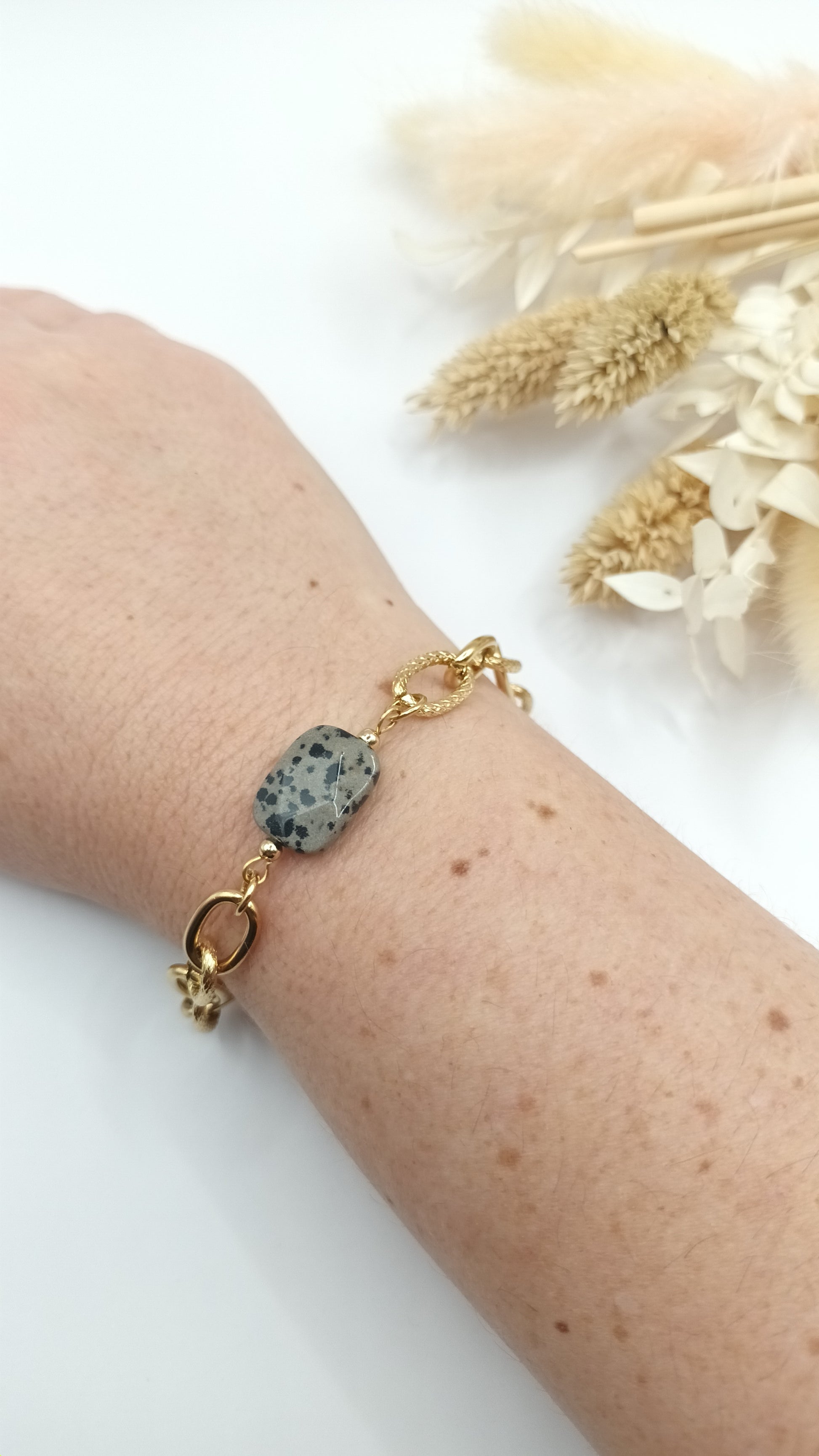 Bracelet femme en acier inoxydable grosse maille ovale et torsadée et pierre de Jaspe Dalmatien.